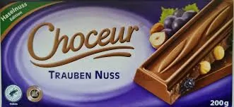 Choceur Trauben Nuss, jemná mléčná čokoláda s celými lískovými oříšky a hrozny, 200g