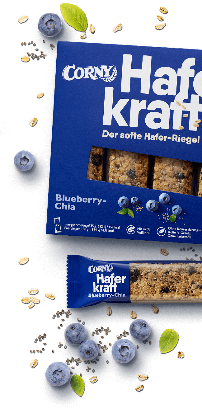 CORNY Haferkraft Blueberry-Chia spojuje plnění ovesných vloček, cenných chia semínek a ovocných borůvek do lahodného a praktického občerstvení mezi tím.