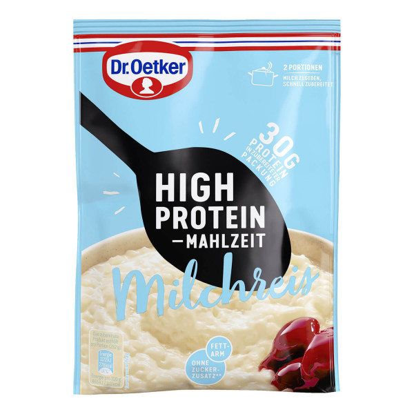 Nekompromisně chutné! dr Oetker High Protein Meal - Rýžový nákyp je skutečnou lahůdkou pro milovníky této sladké klasiky, kteří dbají na výživu. S 30 g bílkovin v připraveném balení, bez přidaného cukru* a nízkým obsahem tuku je dokonalým doplňkem aktivního životního stylu. Upřesněte Dr. Oetker vysoce proteinové jídlo, jak chcete: se skořicí, Dr. Oetker ovocné krupice nebo čerstvé ovoce: The Dr. Oetker High Protein Meal má vždy úspěch a vždy dobře chutná! dr Oetker High Protein Meal - Rýžový nákyp se připravuje velmi snadno: pokrm známý z dětství je hotový za pouhých 10 minut. Žádné připalování a žádné převaření mléka!