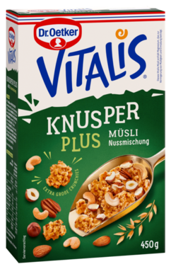 Ve Vitalis Knusper Plus Müsli Nussmischung jsou zlatohnědé pražené křupínky kombinovány s kešu ořechy, křupavými mandlemi, praženými lískovými ořechy a pekanovými ořechy, aby se vytvořil obzvláště ořechový křupavý zážitek. Plus Zlatohnědé křupky se 45% celozrnných ovesných vloček - díky speciálnímu procesu pražení, obzvláště křupavé a chutné. Plus bohaté na vysoce kvalitní vlákninu. Se železem a hořčíkem. Vitalis - potěšení, které je pro vás dobré!
