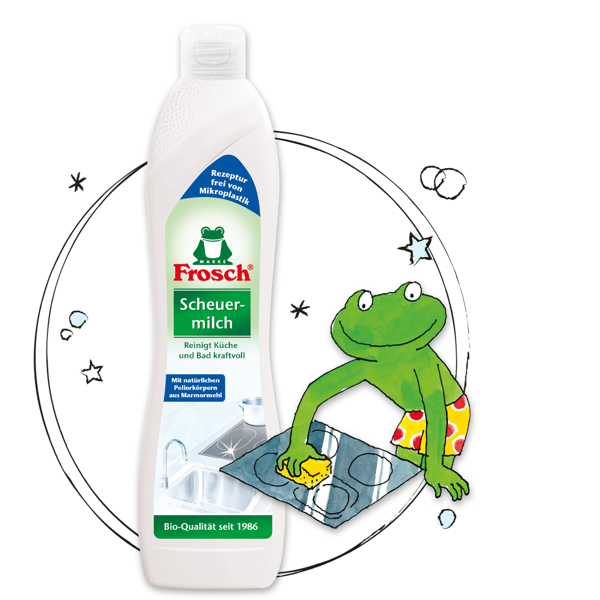 Frosch optimálně odstraňuje všechny druhy nečistot, zejména v kuchyni a koupelně. Receptura s přírodním, mikrojemným mramorovým práškem a vysoce účinnými povrchově aktivními látkami rozpouštějícími tuk silně čistí, odstraňuje inkrustace a vodní kámen a zanechává příjemně svěží vůni. Odličovací mléko je zvláště šetrné k pokožce a materiálům a je ideální pro keramické, smaltované, nerezové a skleněné povrchy, stejně jako elektrické a sklokeramické varné desky.