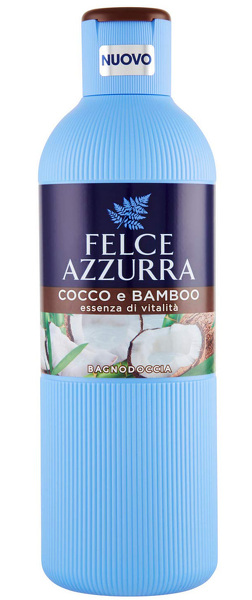 Felce Azzurra Cocconut & Bamboo revitalizační sprchový gel/koupelová pěna je produkt s vyváženým pH, obohacený o hydratační látky, které dodávají vitalitu a svěžest. Díky specifickému složení pečuje o Vaši pokožku bez podráždění. Lesk kokosového ořechu a svěžest bambusu dodávají při sprchování pocit vitality, zanechávají pokožku hydratovanou a příjemně parfémovanou. Dermatologicky testováno.