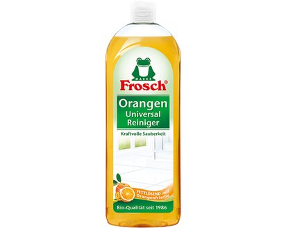 Frosch univerzální čistič s vůní pomeranče účinně čistí podlahy a všechny omyvatelné povrchy v domácnosti. Důkladně odstraňuje mastnotu a nečistoty. Působí díky přírodním rozpouštědlům z pomerančové kůry a zanechává svěží a příjemnou pomerančovou vůni