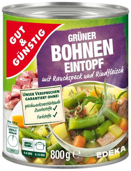 Vynikající fazolový eintopf se šťavnatou uzenou slaninou a hovězím masem. Velice snadná a rychlá příprava - stačí pouze ohřát v mikrovlnce nebo v hrnci.