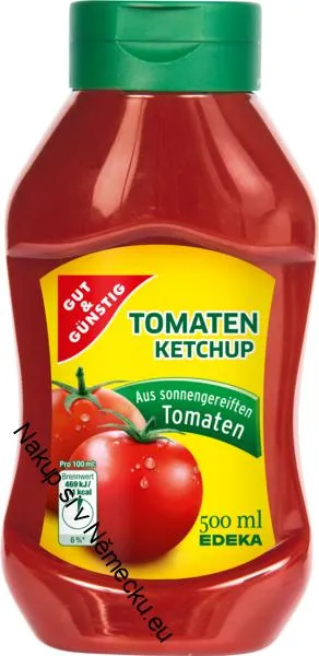 Vynikající, kvalitní kečup s vysokým podílem rajčat. Vyrobeno z na slunci vyzrálých rajčat. Obsah odpovídá zhruba 24 – 26 kusům čerstvých rajčat. Složení: Rajský protlak koncentrovaný 72%, cukr, ocet, sůl,koření, kyselina citrónová. Výživové údaje na 100g: Energetická hodnota: 469kcal/111kj Tuk: 0,2g (z toho 0,1g nasycené mastné kyseliny) Sacharidy: 23,2g(z toho 20,7g cukr), Bílkoviny: 1,7g, Sůl: 2,62g Minimální trvanlivost: uvedeno na víčku. Před otevřením protřepejte. Po otevření skladujte v ledničce a spotřebujte v průběhu 8 týdnů. Edeka Zentrale AG & Co. Kg, Hamburg.