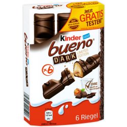 Kinder bueno tmavé Waffle s jemnou krémovou mléčnou krémovou náplní (54 ), potaženou tmavou čokoládou. Křupavé občerstvení: Bueno Dark je pro každého, kdo má rád horkou čokoládu. Křupavá, vzdušná vafle s jemným mléčným lískovým krémovým náplní je v této limitované edici pokryta jemnou tmavou čokoládou. Bar chutná tak hezký čokoládový a lahodný lískový oříšek, ale celkově není příliš sladký. Perfektní občerstvení v odpoledních hodinách - ideální je i na cestách.