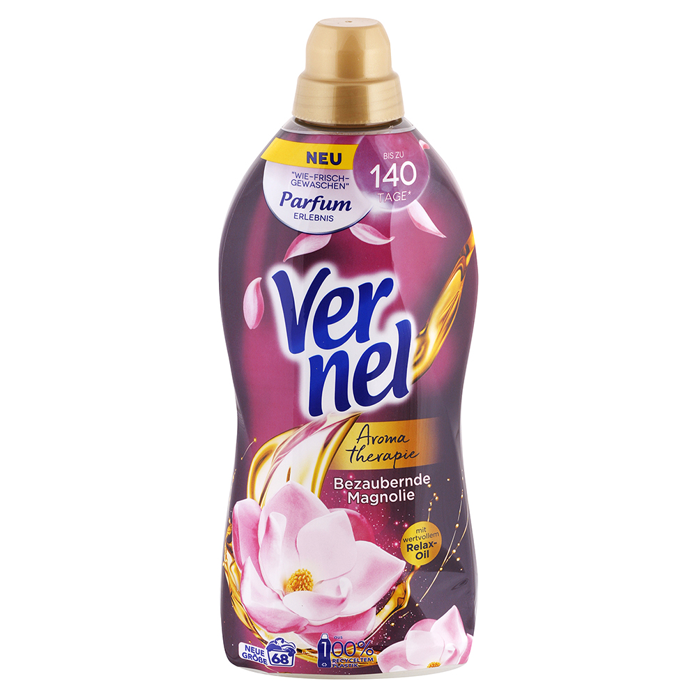 - Vernel Aromatherapy Enchanting magnolia zajišťuje parfémový zážitek, který svádí vaše smysly: vůně s cennými relaxačními oleji udržuje vaše prádlo čerstvé až 140 dní *. Dlouhotrvající vůně díky nové technologii duo-kapsle: čerstvostní perly uvolňují vůni, když se pohybují, a tak poskytují pocit čerstvého praní dlouho po mytí. Speciálně vyvinutý a dermatologický přípravek je šetrný k pokožce a má antistatický adhezivní účinek, nejenže je recept šetrný k životnímu prostředí, ale i láhev je vyrobena ze 100% recyklovaného plastu.