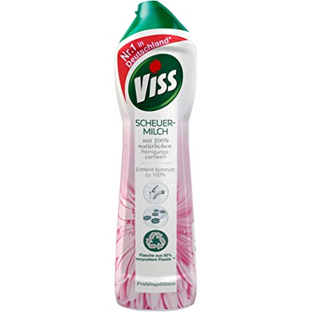 Krémový čistící přípravek Viss Scheuermilch Frühlingsblüten s mikrokrystaly se vyznačuje vysokou účinností, ale zároveň šetrností k čištěnému povrchu. Je tak jemný, že nepoškrábe ani smalt či sklokeramiku. Aktivní látky přípravku proniknou hluboko do nečistot a dokážou tak odstranit i tu nejzašlejší špínu, pomůže odstranit mastnotu, různé krusty, zbytky připečeného jídla i stopy po vodním kamenu. Lehce vyčistí hliník, smalt, kov, sklokeramiku, nerez, mramor, keramiku, plast, laminát, podlahové PVC, plastový zahradní nábytek, vyčistí zašlou bílou koženou sportovní obuv a mnoho dalších. Nevhodný na linoleum a textilie.