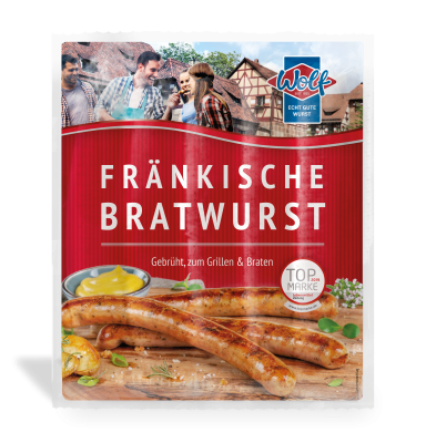Středně velký franský Rostbratwurst od Wolfa, který je vyroben z nejlepších surovin a nejlepšího koření, je oblíbenou specialitou bratwurstu na grilu a pánvi.