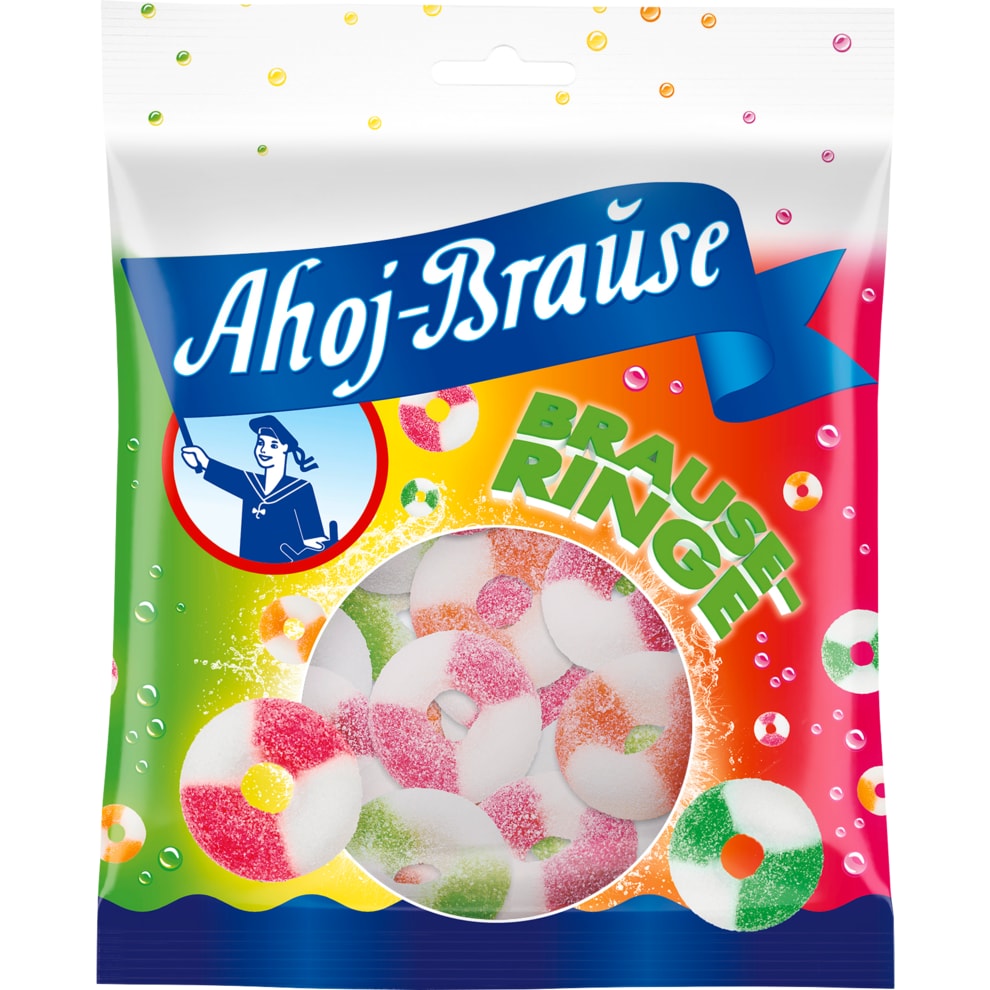 Ahoj-Brause Ringe" jsou jemné a extra kyselé ovocné gumové kroužky. Extra kyselé a pocukrované.