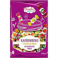 Žvýkací bonbóny Candies World "Kaubonbons" 500 gramů, 5 druhů ovoce s přirozenou chutí.