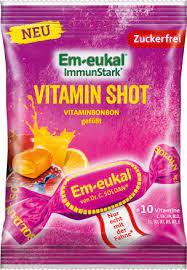 Em-eukal ImmunStark Vitamin Shot plněný je osvěžující ovocný, bez cukru a obsahuje 10 vitamínů. Ovocný bonbón s koncentrátem ovocné šťávy z granátového jablka a pomerančového oleje zaujme svou pikantní, ovocnou chutí ve skořápce a náplni. Vitamíny C, B6, B9 a B12, které obsahuje, mohou také přispívat k normální funkci imunitního systému.