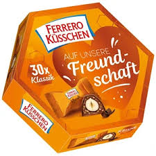 Dárková kazeta s 30 jednotlivě balenými pralinkami v mléčné a polosladké čokoládě s celými lískovými oříšky. Ferrero Küsschen je dlouhodobě jednou z nejoblíbenějších ořechových specialit vůbec. Dva druhy čokolády a celý lískovýořech dělají z Ferrero Küsschen zvláštní zážitek. Křupavé, ořechové a ne tak sladké. Polibek, o který se rád podělí s přáteli a vykouzlí úsměv na rtech.