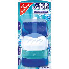 Závěsný WC TRIO blok s trojitou svěží vůní oceánu. Zajistí příjemnou svěží vůni. Pomáhá předcházet tvoření nečistot (vodní a močový kámen). Po každém spláchnutí zanechá hygienickou čistotu.