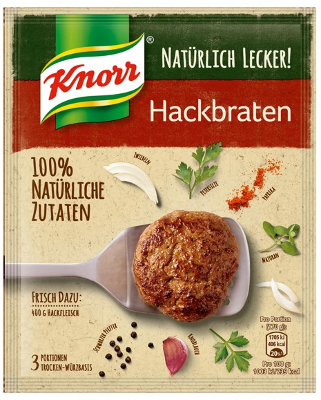 S kořenícím základem Knorr's Naturally Delicious Meatloaf lze rychle a bez námahy připravit dvě různé varianty mletého masa. Máte na výběr: vychutnejte si mleté maso buď ve formě jemných karbanátků nebo jako vydatnou sekanou. Podáváme s trochou zeleniny nebo bramborovou kaší a výsledkem je vydatné a chutné jídlo. Knorr Naturally Delicious Meatloaf Seasoning Base se skládá z těch nejlepších ingrediencí a má vynikající chuť díky různým druhům koření, jako je petržel, majoránka a česnek.