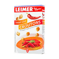 Naše LEIMER Croutons Sweet Chili nejsou smažené, a proto jsou lehkou pochoutkou. Bílý chléb nakrájený na kostičky je jemně opečený a dochucený tím nejjemnějším kořením. Bez umělých zvýrazňovačů chuti.