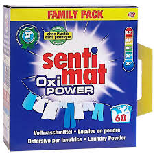 Sentimat 60 pracích dávek Oxi Power universalPrací prostředek s novým složením proti skvrnám pro vaše čisté a zářivě bílé oblečení už při teplotě 30 ° C. Zářivě bílé prádlo začínájí již při 30 ° C. 60 pracích dávek (3,3 kg). Účinné prací teploty 30, 40, 60 a 95 ° C.UPOZORNĚNÍ:Varování. Způsobuje vážné podráždění očí. Uchovávejte mimo dosah dětí. Při zasažení očí: Několik minut opatrně vyplachujte vodou. Vyjměte kontaktní čočky, jsou-li nasazeny, a pokud je lze vyjmout snadno. Pokračujte ve vyplachování. Přetrvává-li podráždění očí: Vyhledejte lékařskou pomoc/ošetření. Při požití: Necítíte-li se dobře, volejte toxikologické informační středisko / lékaře. Je-li nutná lékařská pomoc, mějte po ruce obal nebo štítek výrobku.