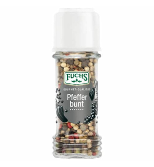 Lyofilizovaný barevný pepř Fuchs harmonicky kombinuje aroma zeleného, bílého a černého pepře. Všechny grilované marinády, smažená jídla, saláty a zelenina dostanou speciální chuť.